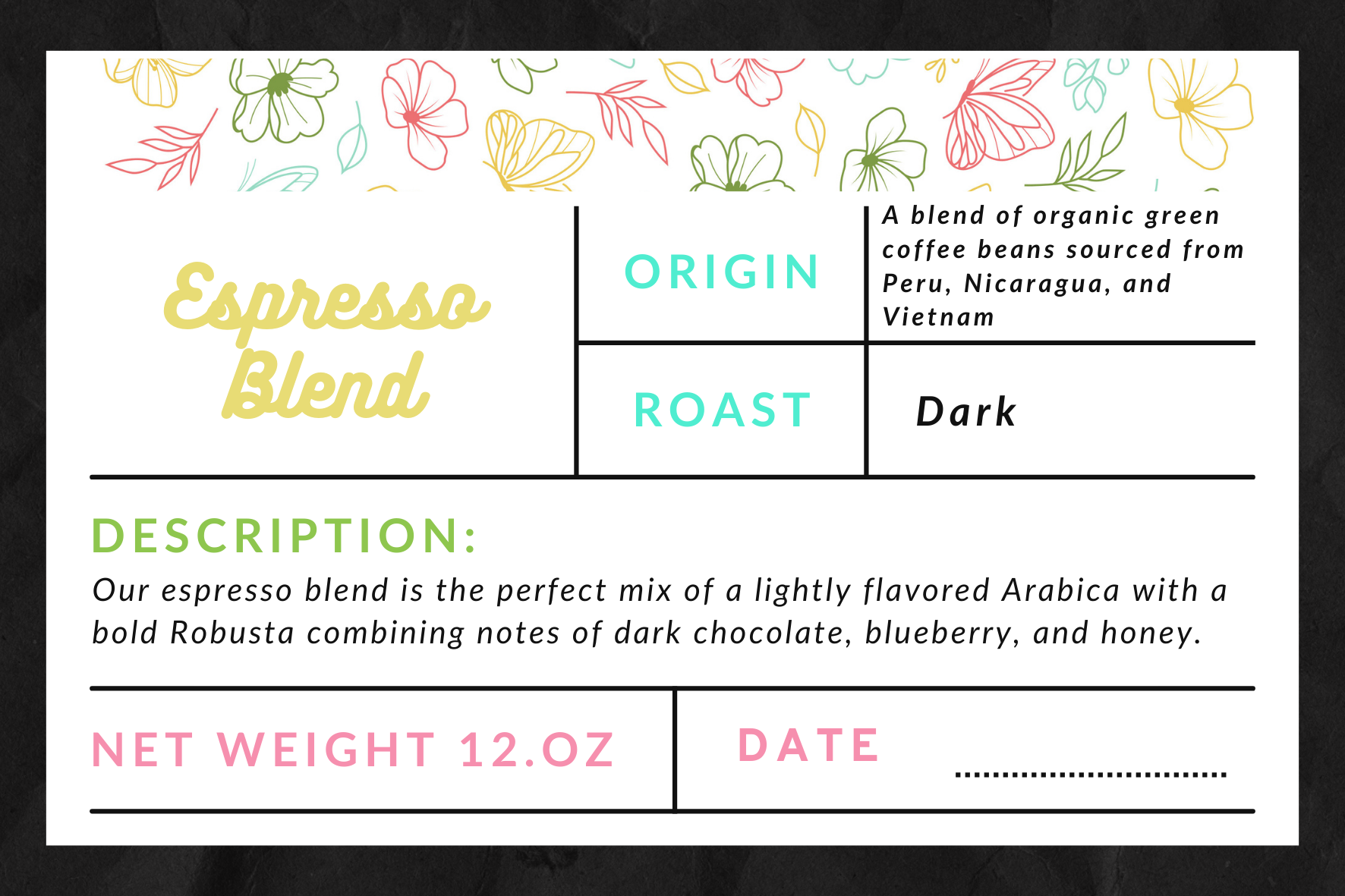 A blend of organic green coffee beans sourced from Peru, Nicaragua, and Vietnam. Our espresso blend is the perfect mix of a lightly flavored Arabica with a bold Robusta combining notes of dark chocolate, blueberry, and honey.